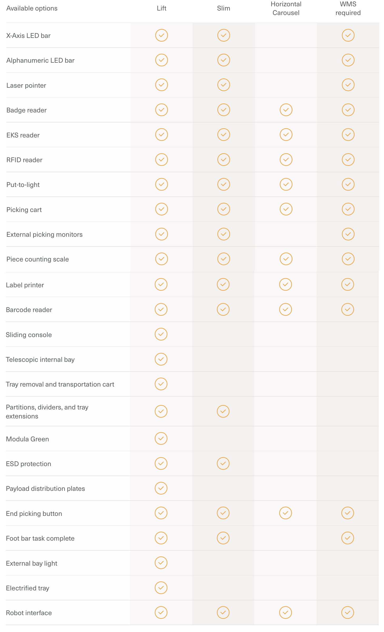 Modula提供各种功能选配项,以进一步增强立体货柜所提供的功能。这些选项可以提高生产力,减轻管理繁重负担,并改善工作环境。 首先选择您感兴趣的Modula自动立体货柜产品,然后浏览可添加的选配项。